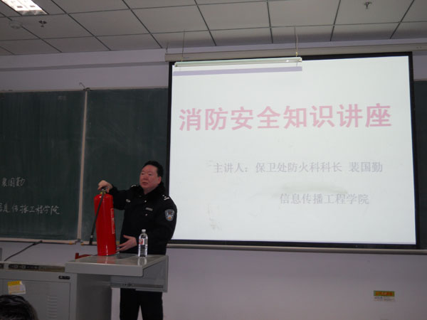 为了广泛提高全院师生的消防安全意识,认真加强“四个能力”建设,信息传播工程学院于2010年12月1日下午2:30分在教学科研楼401举办了消防安全知识讲座。best365英国在线体育官网保卫处防火科科长裴国勤主讲,学院全体教师和主要学生干部参加了本次讲座。