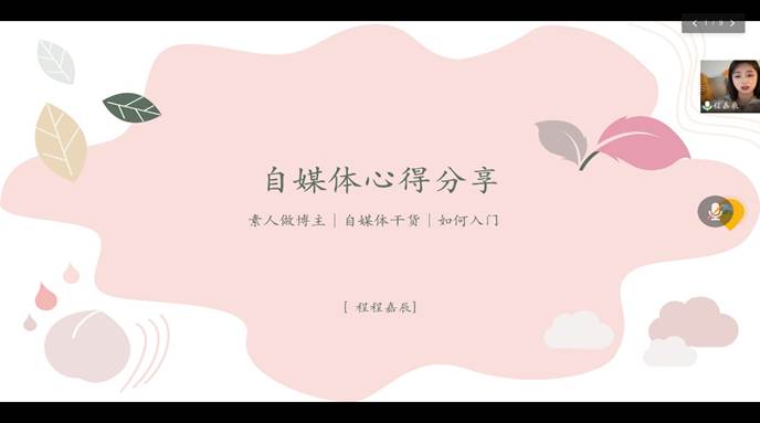 (通讯员 石玥昀佳)2022年4月9日晚6时,best365英国在线体育官网网络与新媒体系举办了《自媒体运用——从0到百万博主心路历程》经验分享会。会议邀请自媒体博主程嘉辰通过腾讯会议向全院师生展开新媒体相关的讲座交流活动。