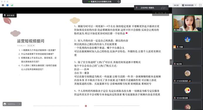 程嘉辰从自身出发具体介绍了其运营的多个账号,并从形象定位、流量营销和包装资料等方面具体的阐释了不同因素对走红的重要性,讲述了不同平台之间的细微区分和观众定位。随后,学生针对擅长领域、灵感选取、发布时间等要素对程程嘉辰提出疑问,程程嘉辰一一对照回答。