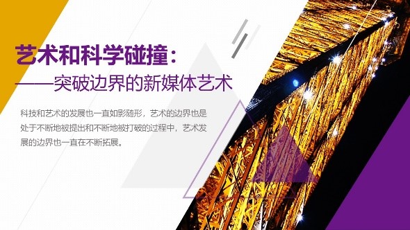 王默副教授在讲座中指出新媒体艺术借助科技与艺术的结合,突破了传统对艺术的认知界限,促使新媒体艺术的产生。科技发展为艺术提供更多展示空间和创作灵感,更打破两者之间的固有界限,提供更多的协同创新。“突破边界的艺术”不只针对艺术无界限,同样是对生活界限的一种试探与思考。报告从认识新媒体、新媒体艺术简史、突破艺术的边界、新媒体艺术维度特征四个方面展开并结合实例进行详细介绍。