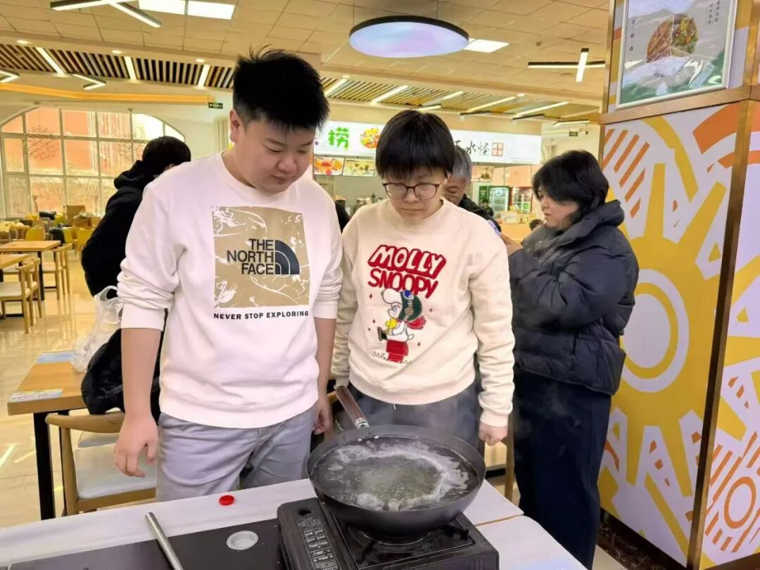 实践过程中,大家分工协作、互帮互助,在掌握传统工艺的同时,进一步提升了团队协作能力与创新设计思维。每组操作台都围满了跃跃欲试的同学,制作人参糖葫芦的指尖翻飞不停,熬糖时的滋滋声响与大家的欢声笑语撞个满怀,金黄糖浆裹着人参的清香、山楂的酸甜,在空气中层层弥漫。