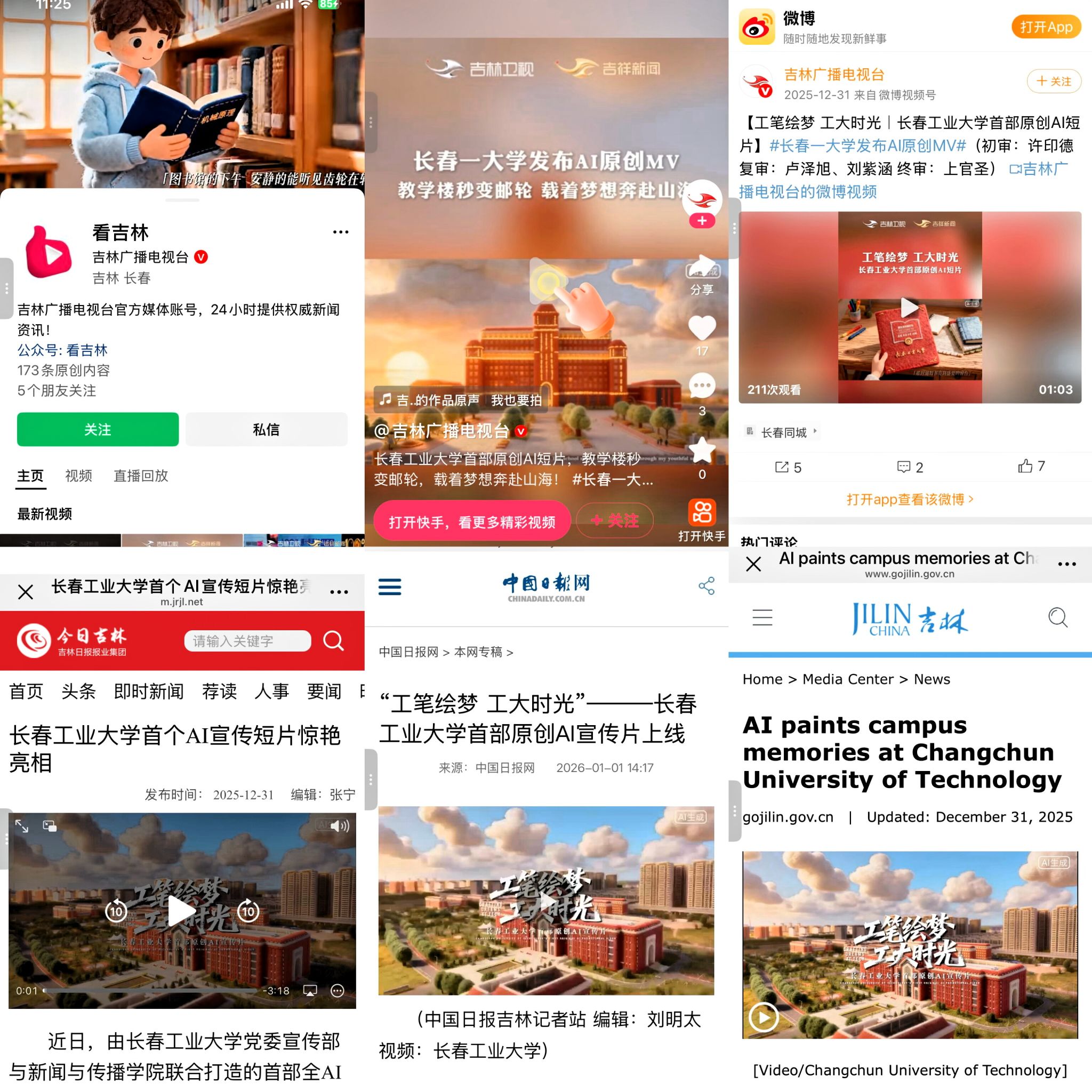 作为学院践行“AI+教育”项目的生动实践,《工笔绘梦·工大时光》相关话题也引发网友与校友的热烈讨论,评论区满是对校园时光的追忆与对学校发展的祝福。在其他视频平台,短片同样表现亮眼,微博、视频号等平台的转发与分享量持续增长。此外,吉林广播电视台、中国日报吉林网、吉林日报英文版、掌上吉林、今日吉林网等多家省级媒体平台进行报道、并转发视频短片,形成跨圈层传播效应,进一步扩大了学校的品牌影响力。