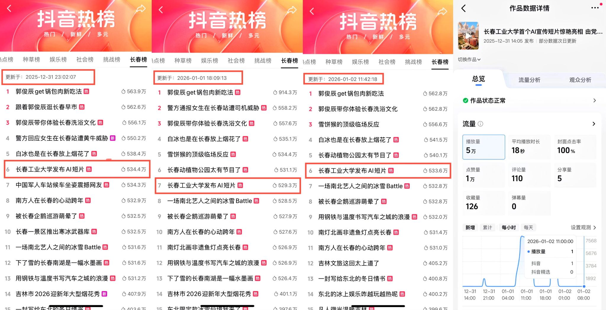 本网讯(通讯员 邢雪婷)近日,学校首个全AI短片《工笔绘梦·工大时光》正式发布,以前沿AI技术串联师生四年成长时光,生动展现学校办学底蕴与青春活力。短片一经发布便引爆全网热度,在多平台形成传播热潮,2025年12月31日开始连续多天热度超500万,强势稳居抖音热榜长春榜前十,“CCUT青春新传”账号播放量破5万、点赞量1万,评论、转发、收藏数量暴增,成为新年伊始高校校园文化传播的亮眼名片。