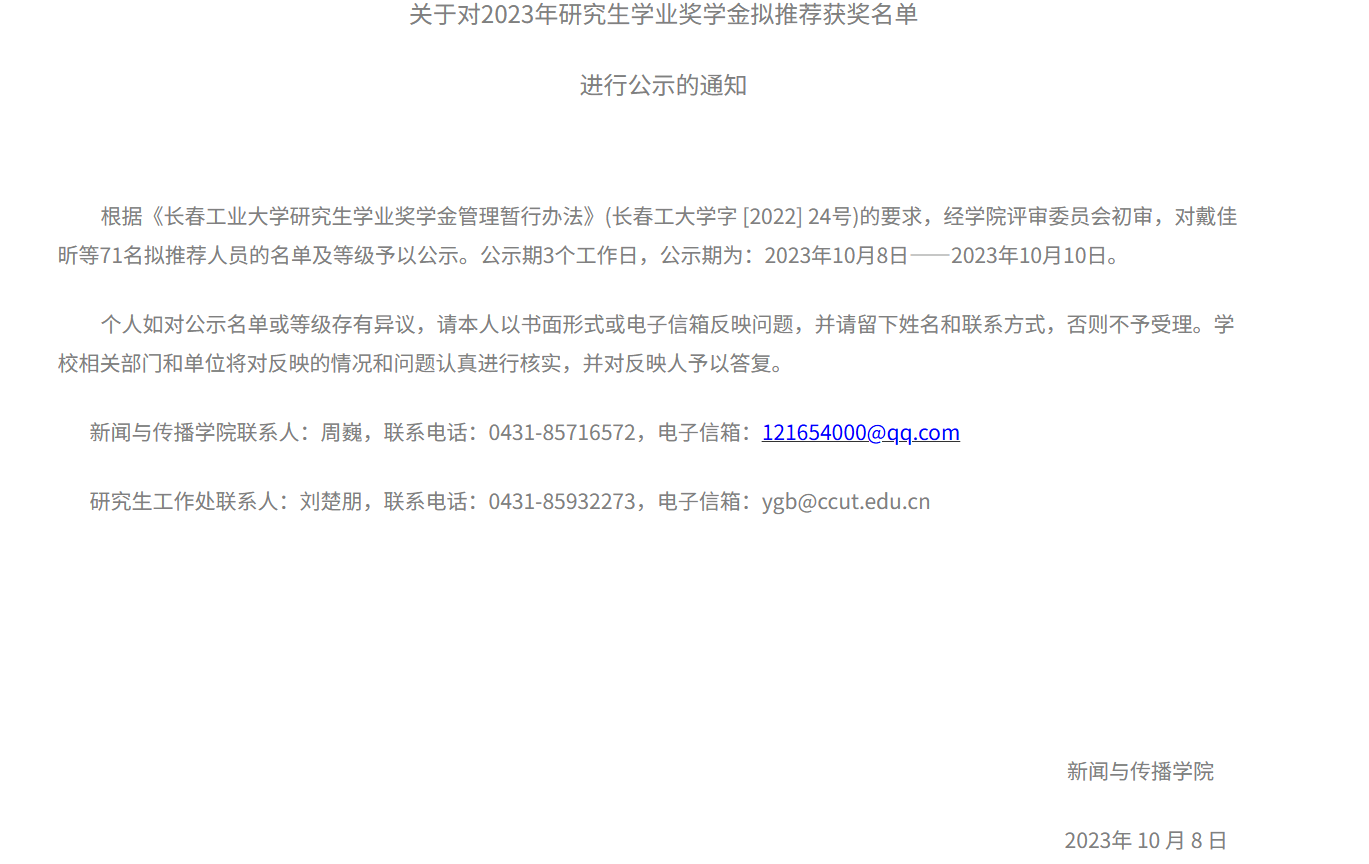 关于对2023年研究生学业奖学金拟推荐获奖名单进行公示的通知