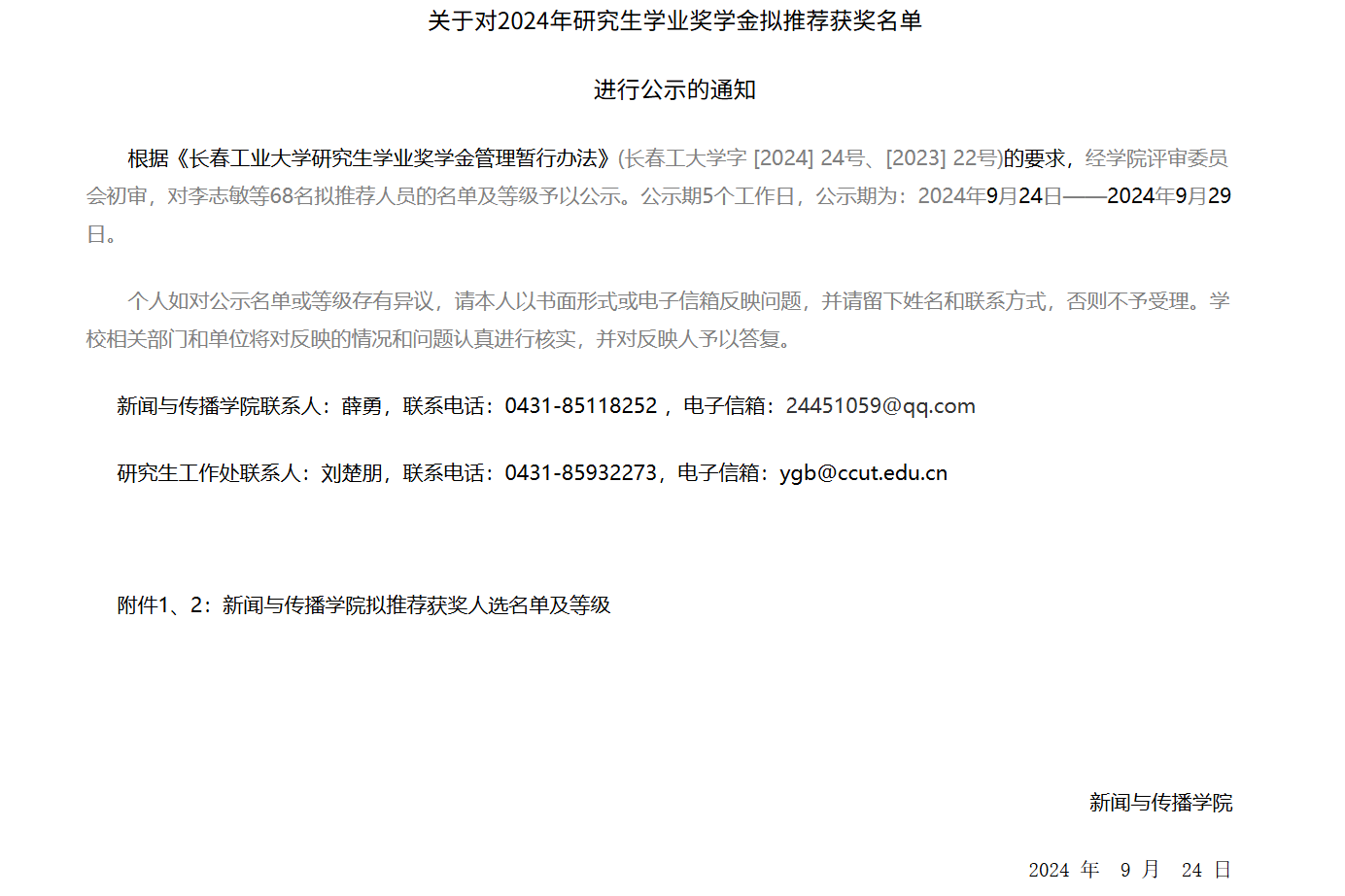 关于对2024年研究生学业奖学金拟推荐获奖名单进行公示的通知
