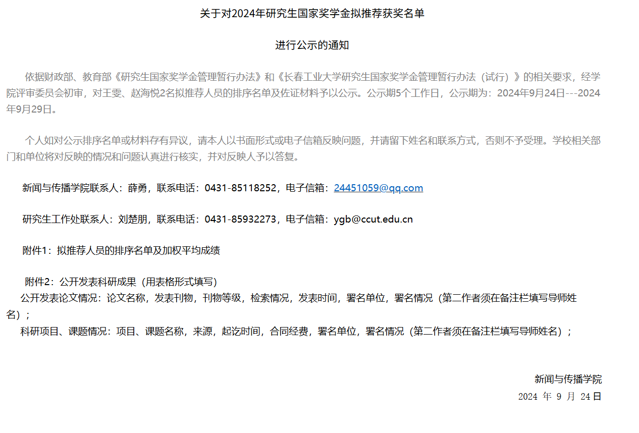 关于对2024年研究生国家奖学金拟推荐获奖名单进行公示的通知